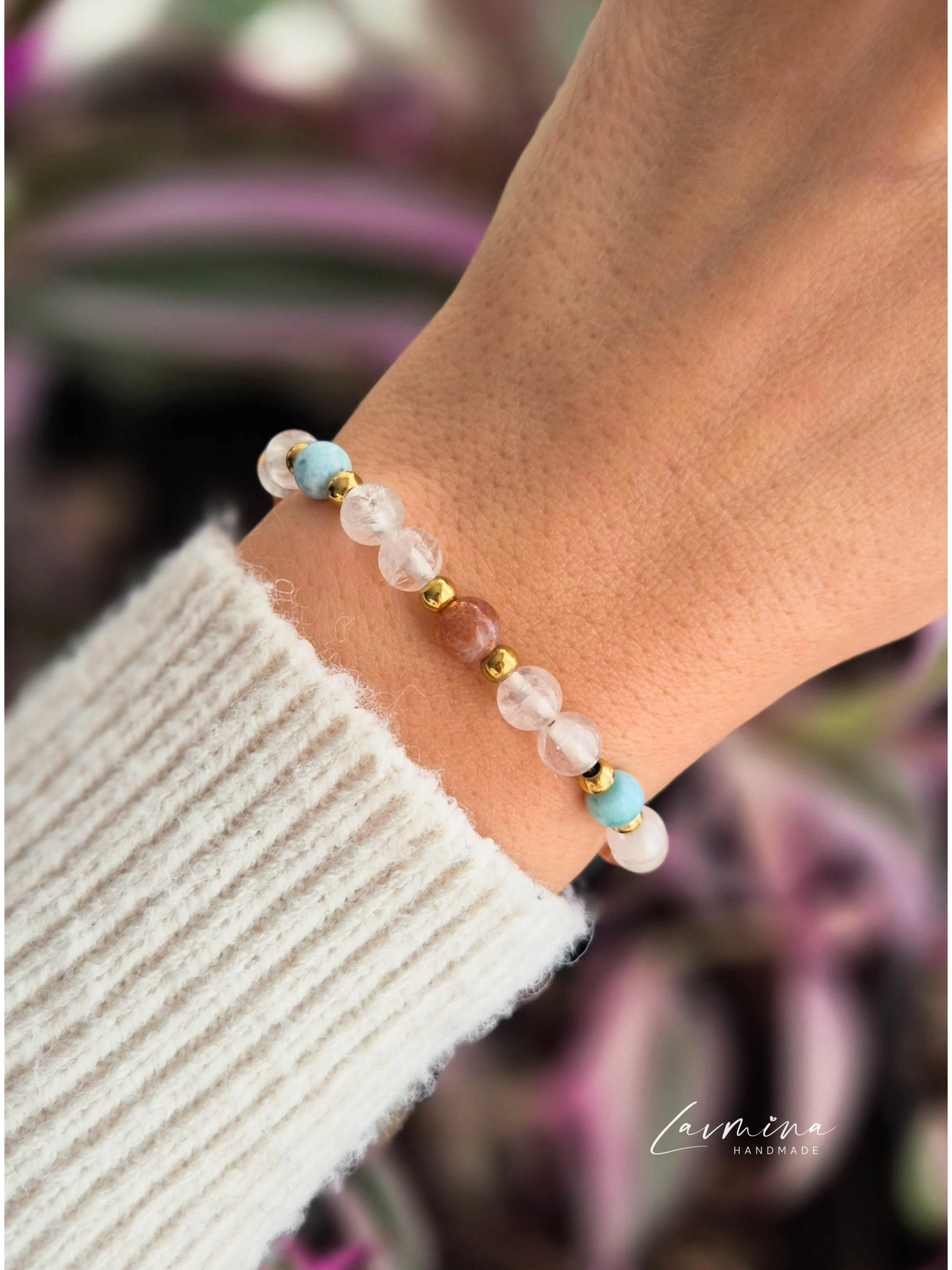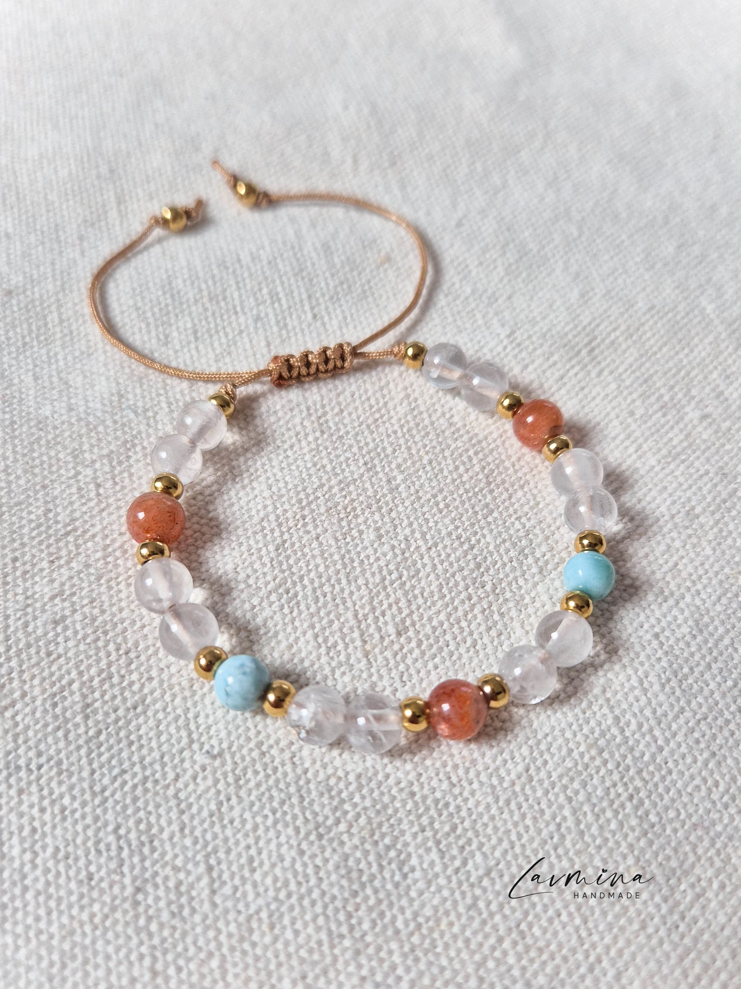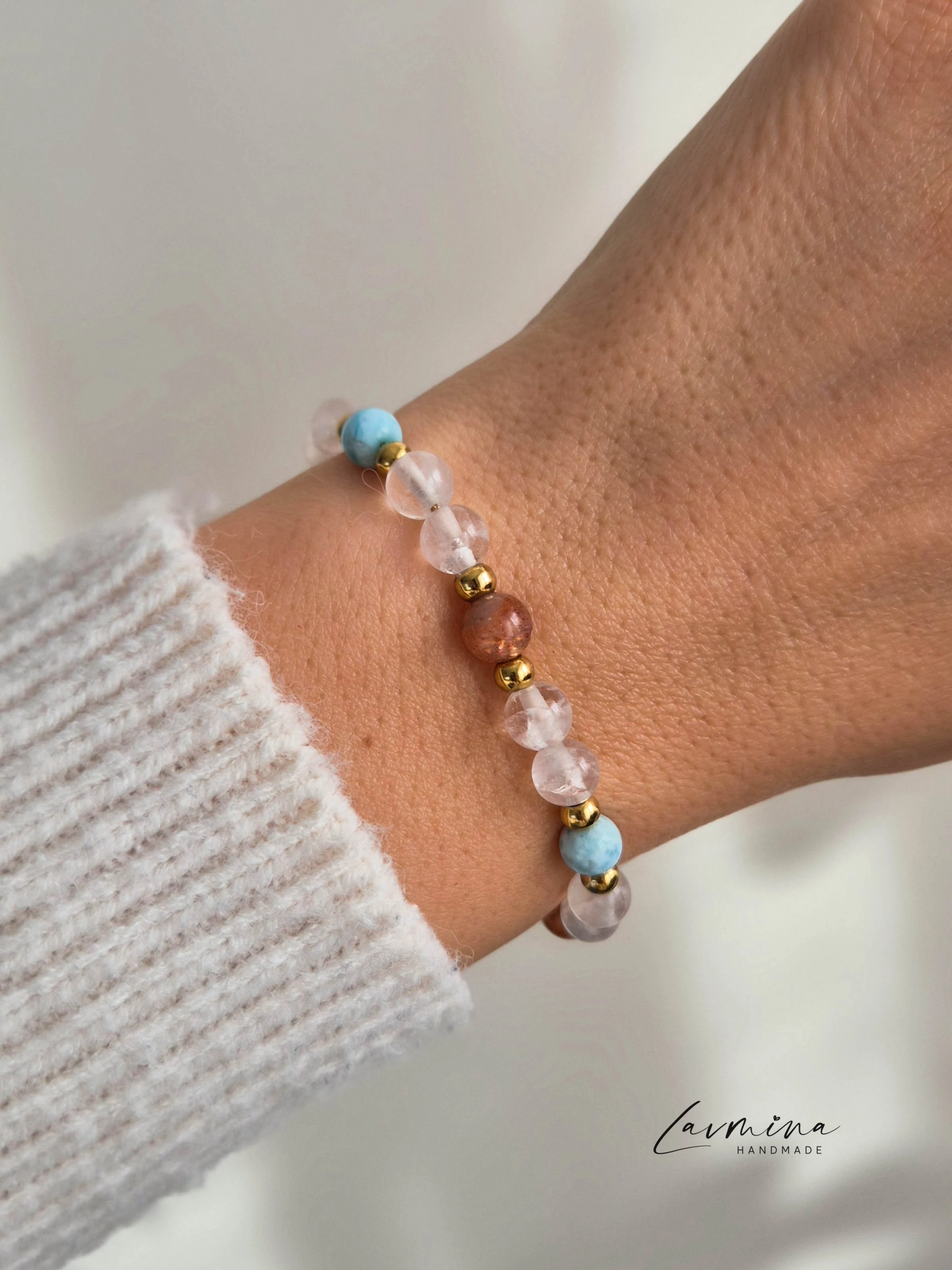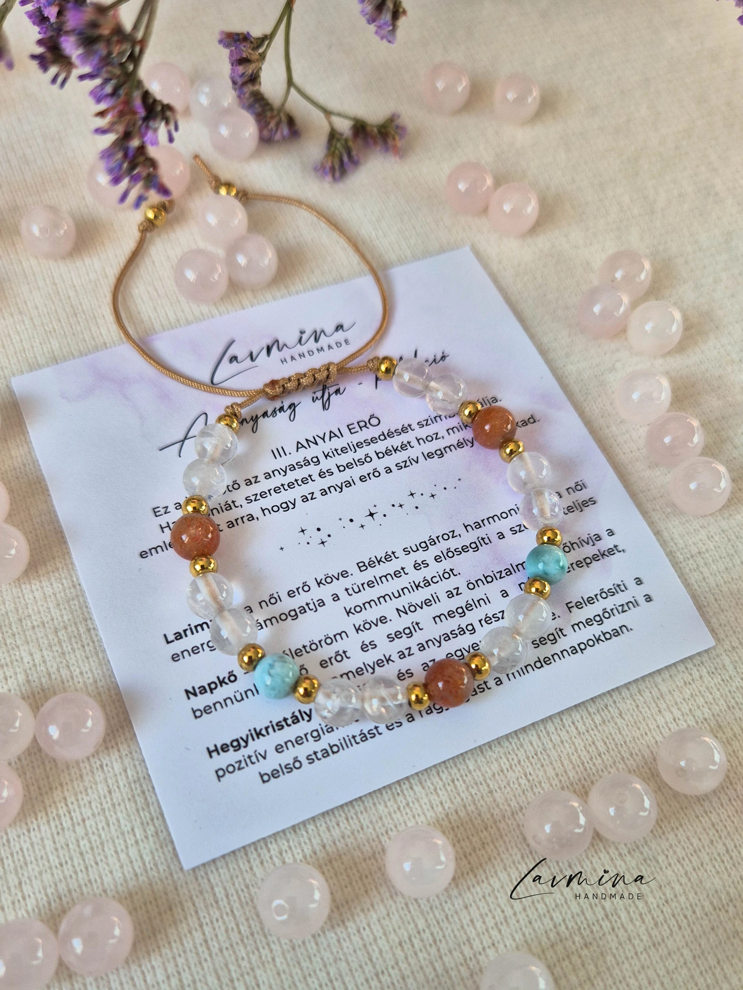 III. Anyai erő˙⋆✮ Karkötő az anyaság kiteljesedéséért és a belső stabilitásért ✮⋆˙ Az anyaság egy életre szóló utazás, annak minden csodájával és kihívásával együtt. Ez a karkötő azért jött létre, hogy finom támaszt nyújtson a mindennapokban és segítsen visszatalálni ahhoz az erőhöz, amely a szíved végtelen szeretetéből fakad. KÖVEK ÜZENETE✦ Larimar — a békés kommunikáció és a szeretetteljes önkifejezés köve ✦ Napkő — önbizalmat, életörömöt és ragyogó női energiát hoz ✦ Hegyikristály — felerősít minden pozitív szándékot, stabilitást ad és tisztítja az energiákat Mindannyiszor, amikor ránézel, jusson eszedbe: erős vagy - és szeretve vagy. Kényelem és minőség✦ Minden ásvány gondosan válogatott és drágakőszakértő által bevizsgált, ami garantálja eredetiségét és egyedi energiáját. Használati tudnivalók✦ Kerüld a közvetlen érintkezést parfümmel, krémmel, hajlakkal és vegyszerekkel. ♡ Ajándéknak is tökéletesMinden karkötő egy kártyával érkezik, amely leírja a kövek szimbolikus jelentését - szívhez szóló, személyes ajándék lehet kismamáknak és édesanyáknak egyaránt. ♡ Minden karkötő egyediAz ásványok színe, mintázata és fényessége természetes módon eltérhet — ez teszi igazán különlegessé, megismételhetetlenné.