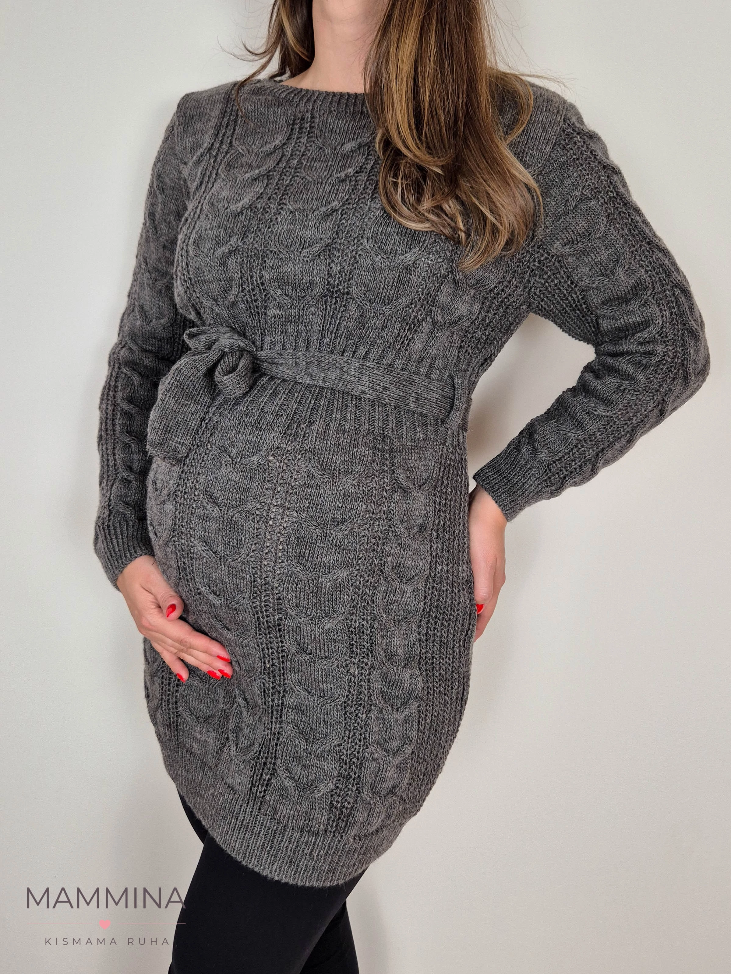 Sötétszürke, vastag kötött kismama tunika gyönyörű fonott mintával és övvel. Kellemesen meleg, rugalmas anyagból készült, így tökéletes viselet a hidegebb napokra. Az öv segítségével szépen kiemelhető a pocak vagy a derékvonal, ezért várandósság alatt és szülés után is csinos, nőies megjelenést biztosít. Könnyen kombinálható leggingsszel, farmerrel. Méretnélküli S/M méretre ajánljuk. A modell 160 cm magas.