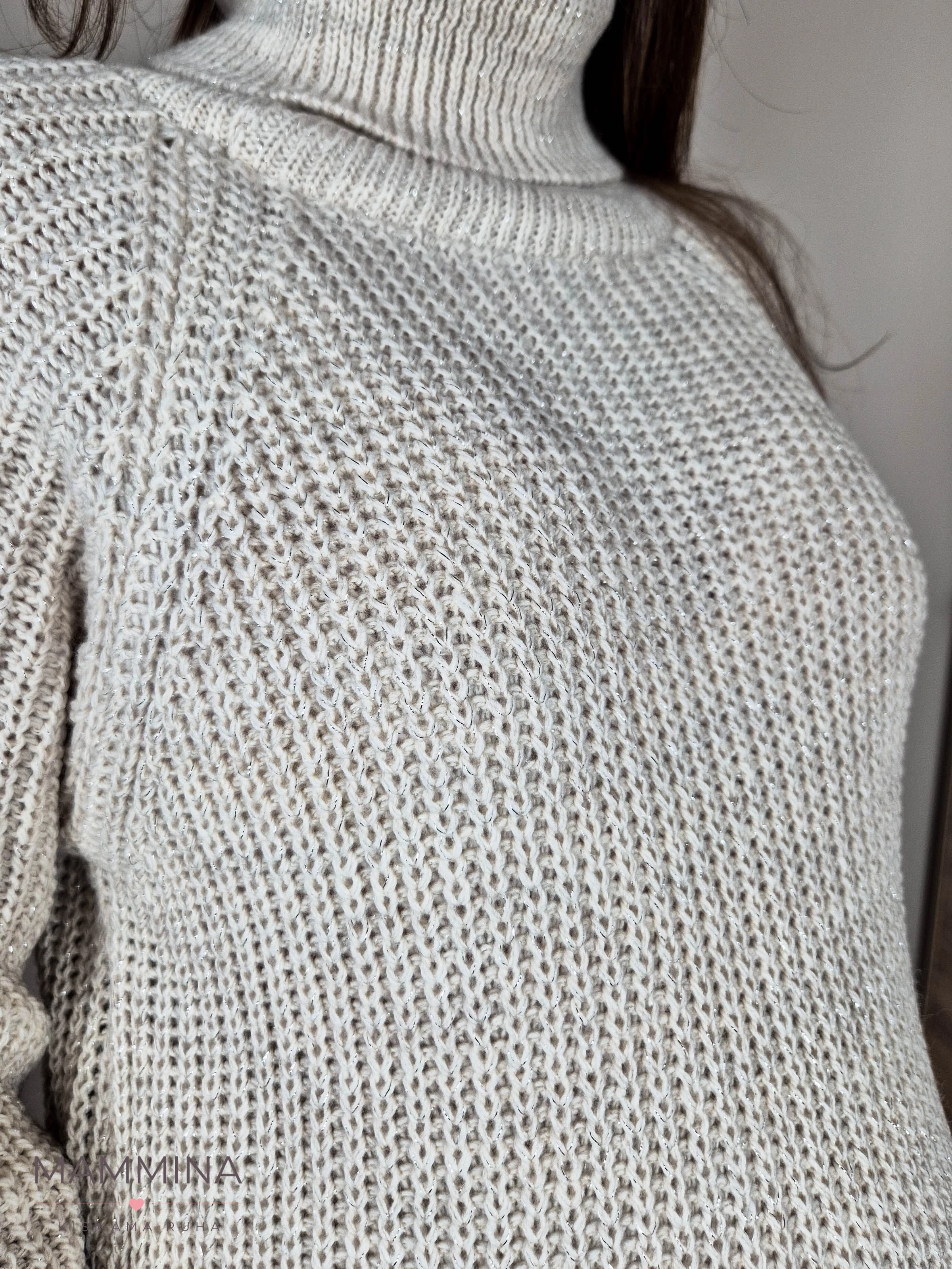 Meleg, rugalmas anyagból készült, így tökéletes választás a hűvös napokra. Két oldalán sliccelt kialakításának köszönhetően kényelmes mozgást biztosít, a garbó nyak pedig extra meleget ad. Anyagában ezüstös, csillámló szálak futnak, melyek különleges megjelenést kölcsönöznek a darabnak. Méretnélküli fazon, amely kényelmesen viselhető S, M és L méretre is. A modell 164 cm magas. |