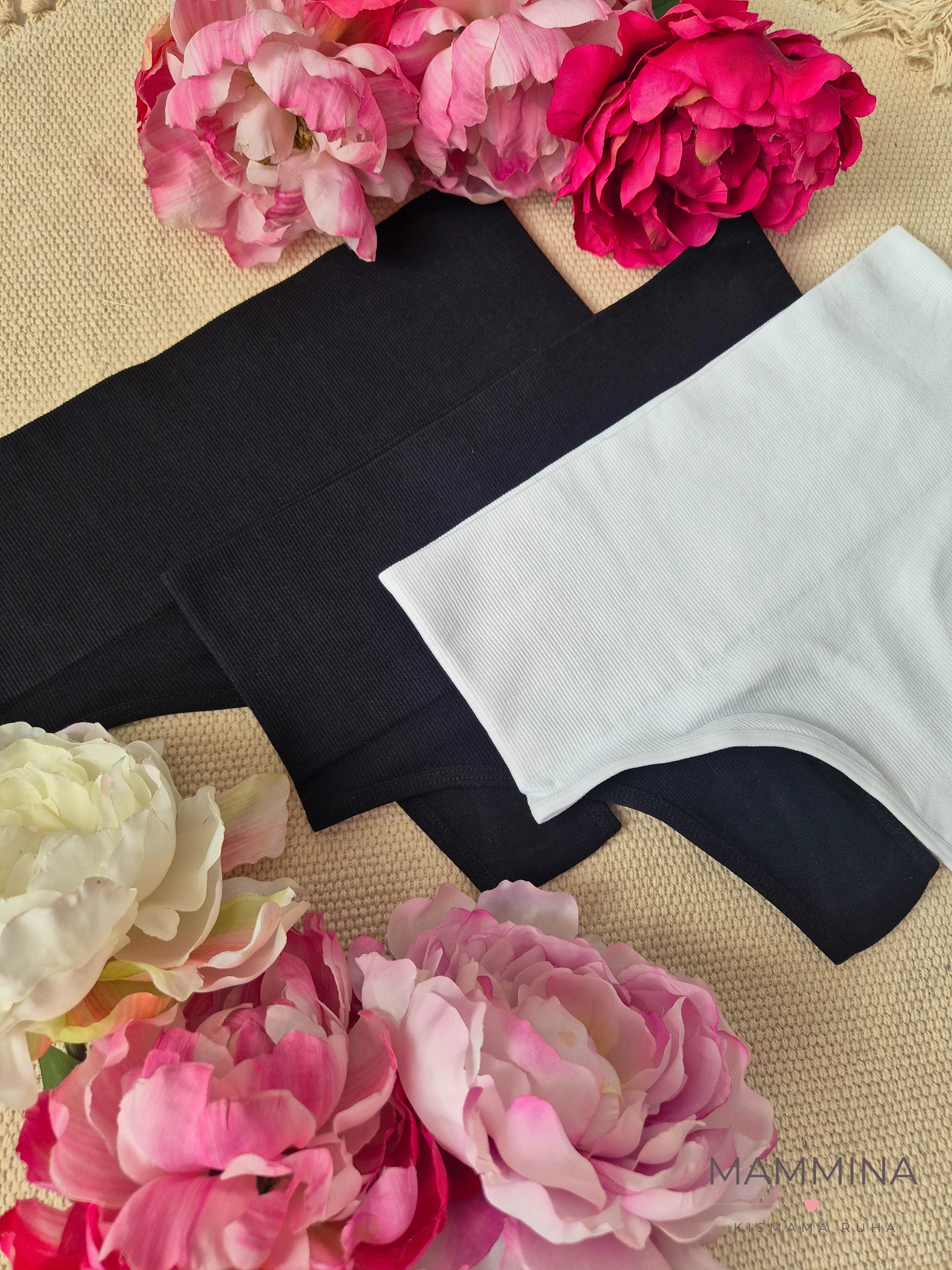 Élvezd a természetes, egész napos kényelmet puha, rugalmas anyagból készült tangáinkkal! A magas derékrész finoman tartja az alhast, miközben nem vág be a csípőbe vagy a derékba, így minden ruhában magabiztosan viselheted őket. A csomag két színt tartalmaz: 1 db fehér és 2 db fekete. Csak szülés után viselhető! Méretezés a leírásnál található. |